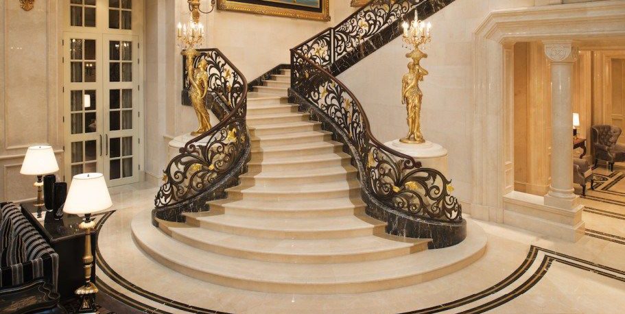 • Thiết kế: Sử dụng Đá Marble Kem/Vàng kết hợp với lan can sắt mỹ thuật uốn lượn cầu kỳ. Các cạnh đá được chạy chỉ bo tròn mềm mại, tôn lên vẻ quý phái, vương giả.